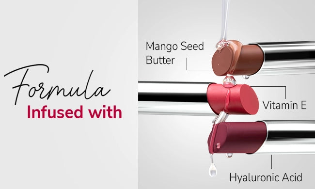 Enriched with Hyaluronic Acid, Mango Butter, and Vitamin E, this lipstick delivers not only long-lasting wear but also essential lip hydration. Hyaluronic Acid helps to lock in moisture, while Mango Butter softens and smooths your lips. Vitamin E provides antioxidant benefits, keeping your lips looking and feeling healthy. This blend of nourishing ingredients ensures that your lips remain hydrated and conditioned with each application, even as you flaunt a beautiful matte finish.