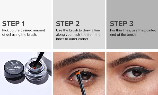 - Use the high precision brush to draw a line along your lash line from the inner to outer corner.